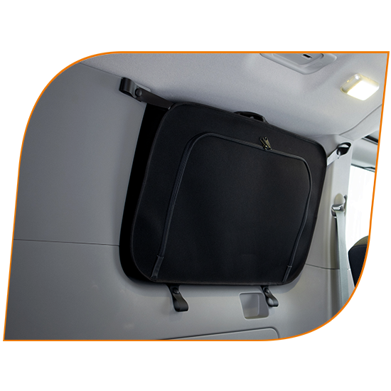 Fahrzeugspezifische Fenstertaschen runden das Raumkonzept ab. Sie bieten praktischen Stauraum für Kleidung und Reiseutensilien, passen sich exakt der Fahrzeugkontur an und sorgen gleichzeitig für einen sauberen Abschluss sowie zusätzlichen Sichtschutz.